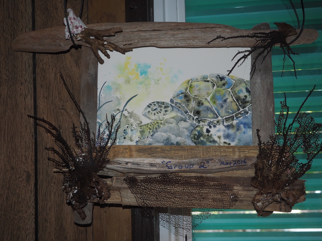 The resort encourages guests to leave a little something behind and has an annual contest. Group 2's contribution was an idea by Merribeth with a watercolor by Valerie based on a photo by Andy with a frame of found items by Ann & Merribeth which was glued together by Greg and hung by Peter.