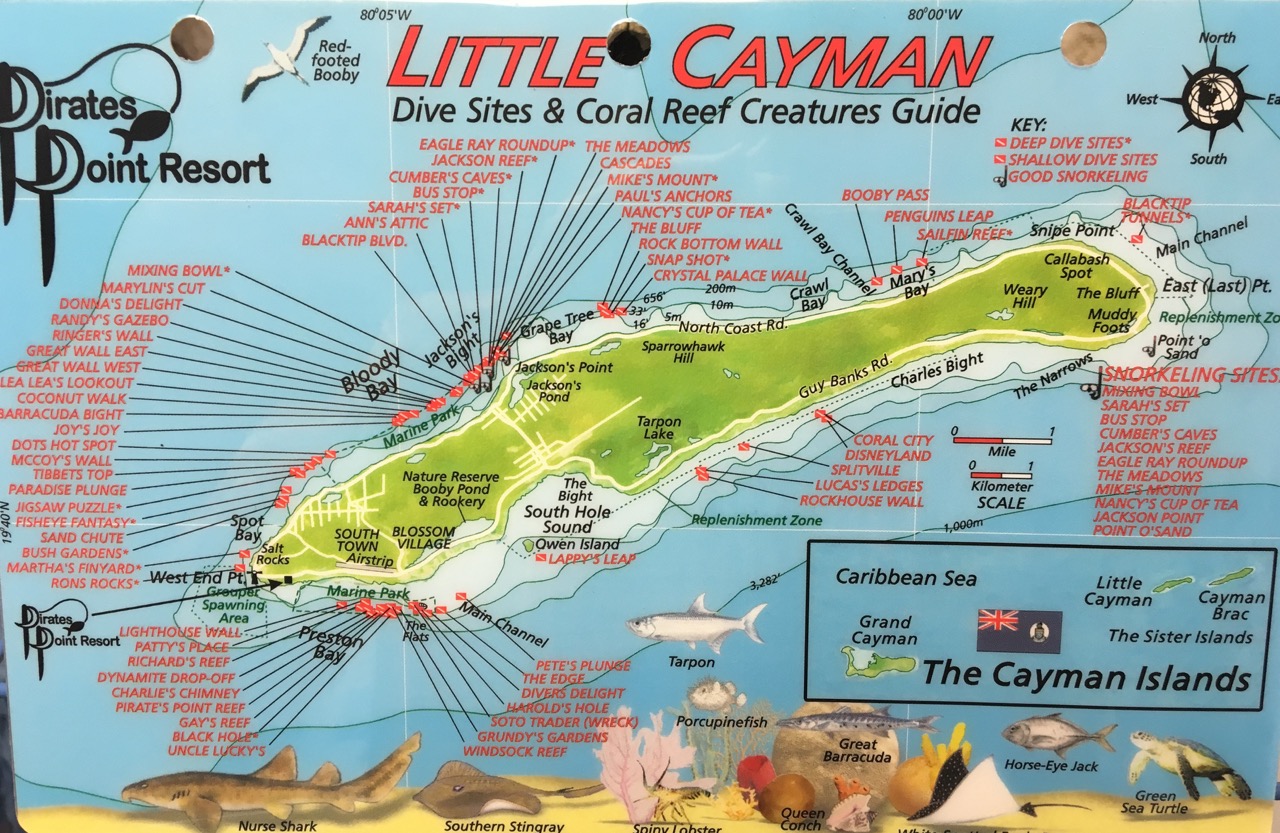 Here's a map of the dive sites off Little Cayman with the resort's location shown. The most famous dive sites are on Bloody Bay Wall and Jackson's Bight; fortunately we could get to those sites every day.