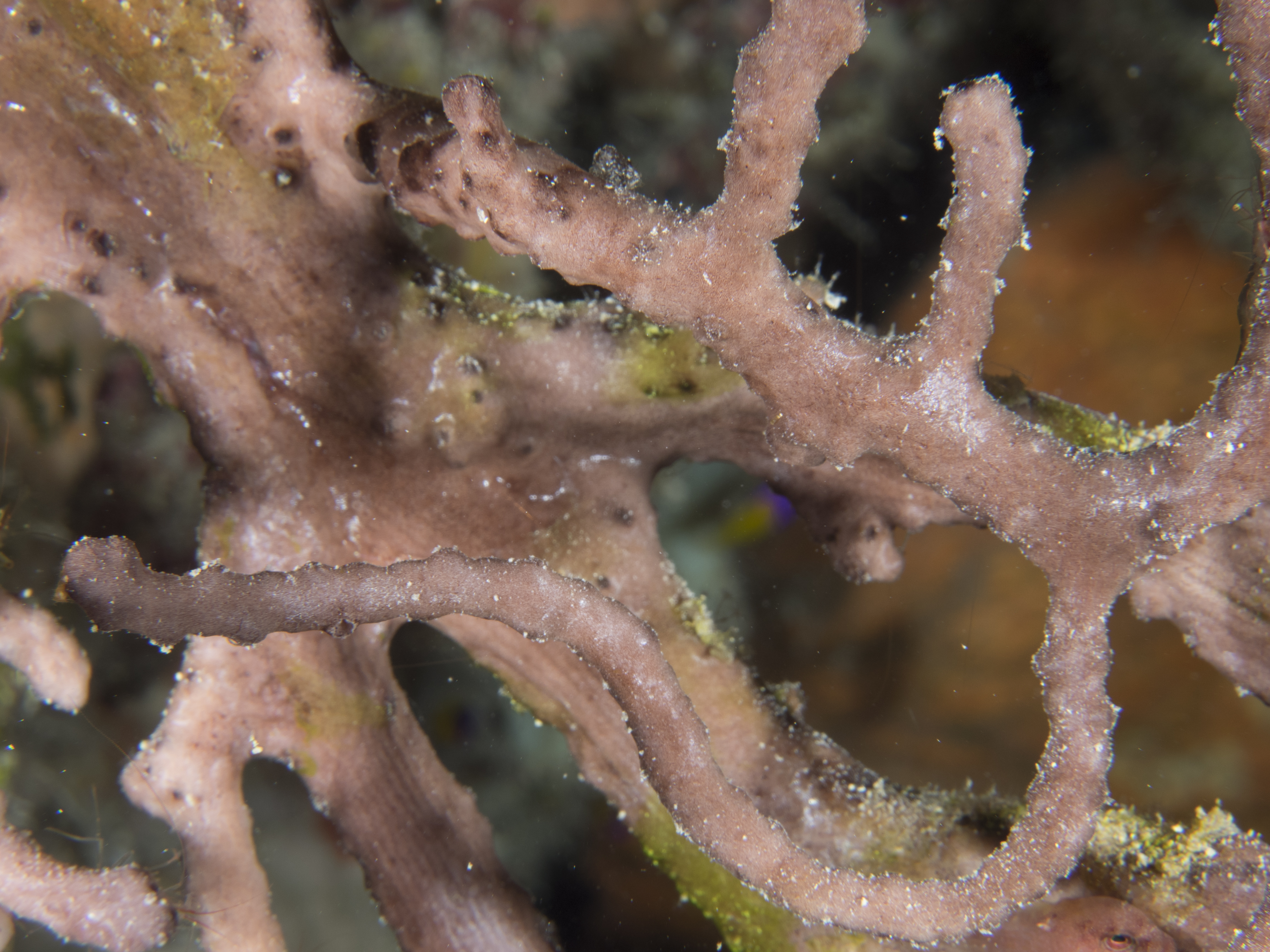 A favorite photo. I knew there was supposed to be a Clingfish here somewhere (never have seen one) but couldn't really locate it so took a photo focusing on the little knobby bit to right center which is just part of the coral. There is a half a Clingfish in the photo though!